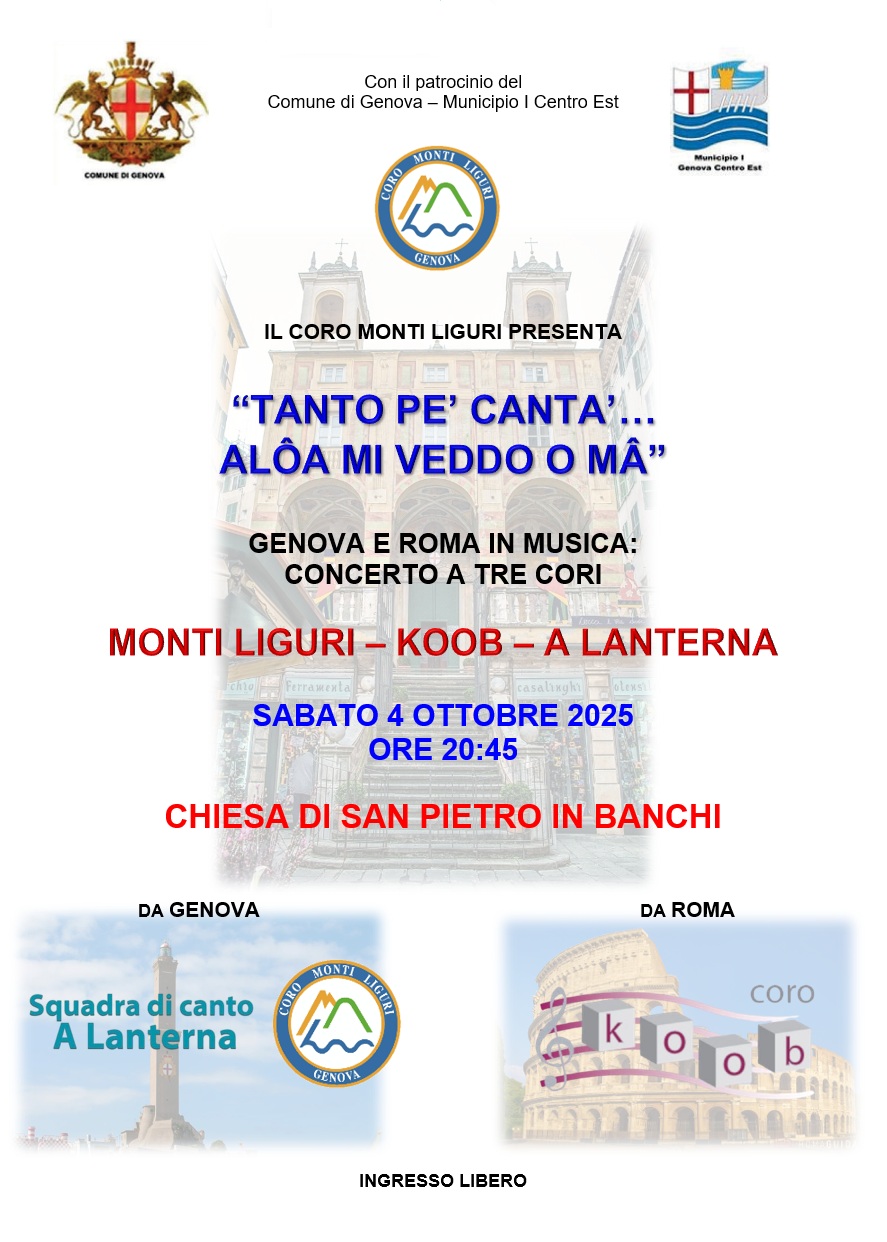 Sab 4 Ottobre ore 20.45 | Chiesa di S. Pietro in Banchi, p. Banchi, Genova | CONCERTO "TANTO PE' CANTA'.. ALÔA MI VEDDO O MȂ", incontro col coro KOOB di Roma e con la squadra di canto genovese A LANTERNA - Repertorio popolare di montagna, italiano e internazionale, e tradizionale genovese. Tre concerti in uno! |