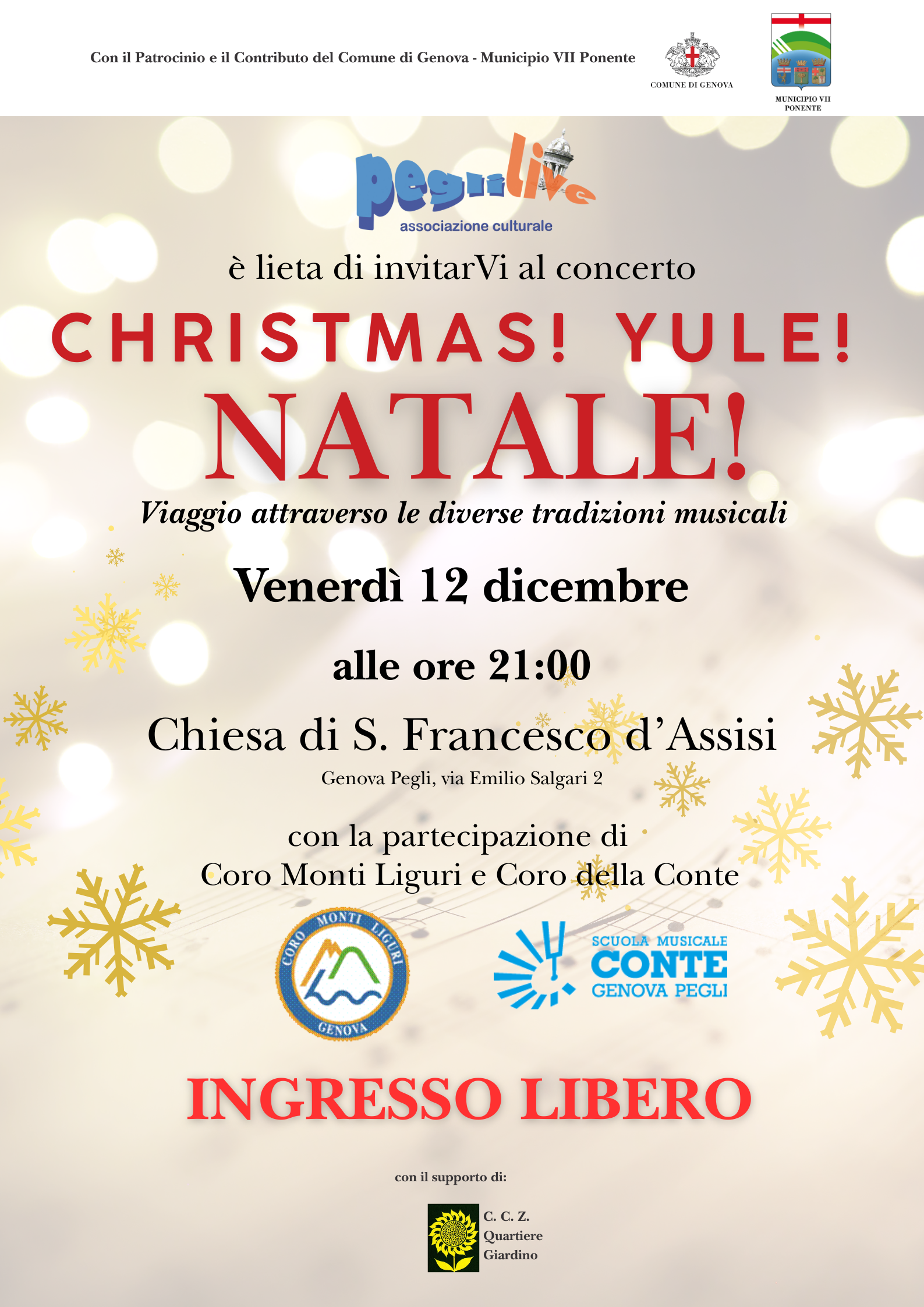 | Ven 12 Dicembre ore 21.00 | Chiesa di San Francesco d'Assisi, via Salgari 2, Genova | YULE! CHRISTMAS! NATALE! Concerto natalizio a più voci e più stili, dalla tradizione armonica a cappella alle moderne sonorità e ritmi. Con i cori Monti Liguri e della Scuola Conte di Pegli |