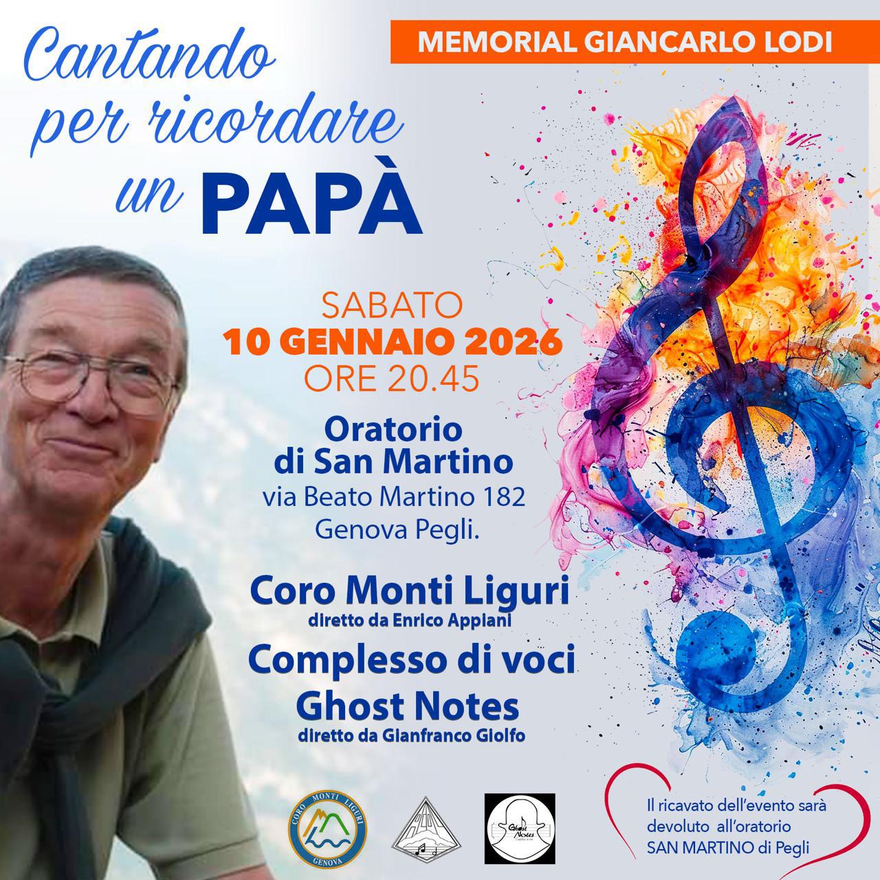 | Sab 10 Gennaio ore 21.00 | Oratorio di San Martino, v. Beato Martino 182, Genova Pegli | MEMORIAL GIANCARLO LODI 5a edizione - Si rinnova il ricordo in musica del nostro indimenticabile cofondatore |